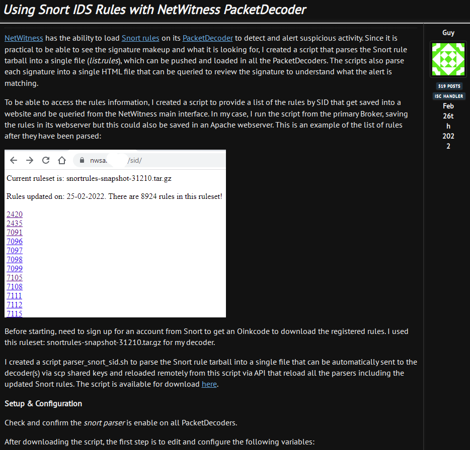 2022年2月28日CK's Technology News @CKsTechnologyNews@mastodon.socialUsing #Snort #IDS Rules with #NetWitness #PacketDecoder Nice post. https://isc.sans.edu/forums/diary/Using+Snort+IDS+Rules+with+NetWitness+PacketDecoder/28382 0