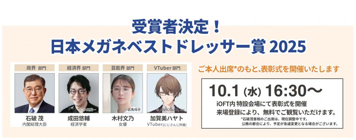 『日本メガネベストドレッサー賞』受賞者決定 石破茂、木村文乃、成田悠輔、加賀美ハヤト